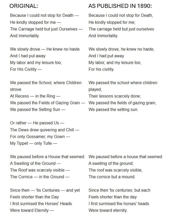 Whenever I come across a tome of Dickinson’s poetry, the first poem I check – to determine if the book contains original versions (i.e., as written by Dickinson) or the filtered versions – is “Because I could not stop for Death.”