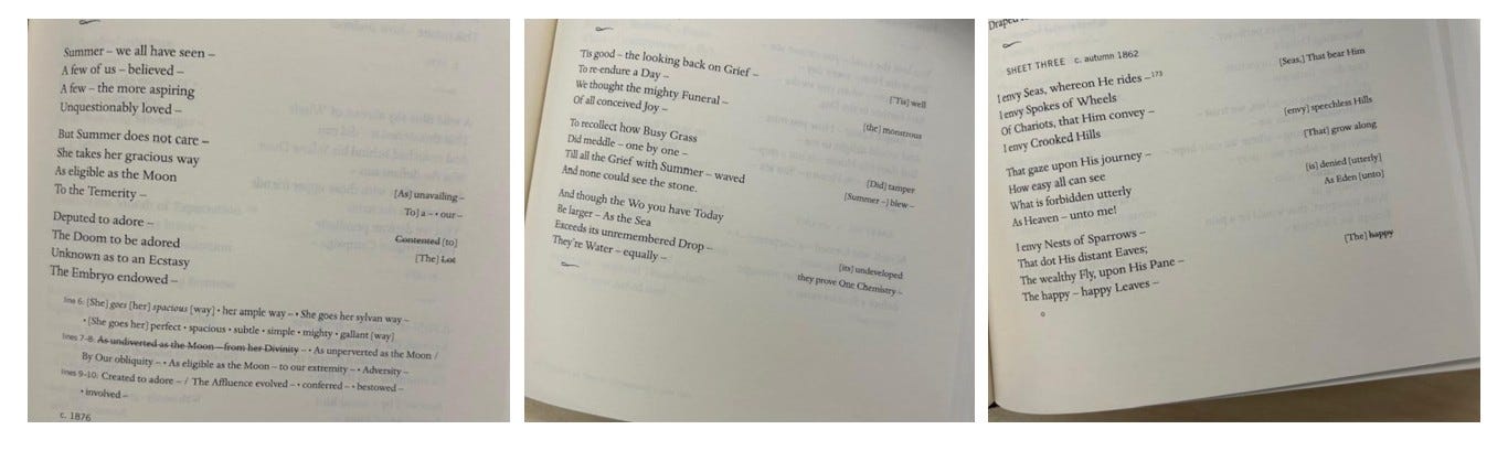 Things do get a bit foggy with some of the poems because Dickinson recorded numerous alternative word choices and phrases. The Miller edition includes the alternate possibilities on the right side of the page.